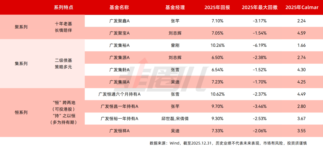 2025年大火的“固收+”,廣發基金也有清晰的產品線。通過“聚、集、恆”系列化運作,將不同風險與策略封裝成易懂的解決方案,大幅降低投資者的選擇成本。