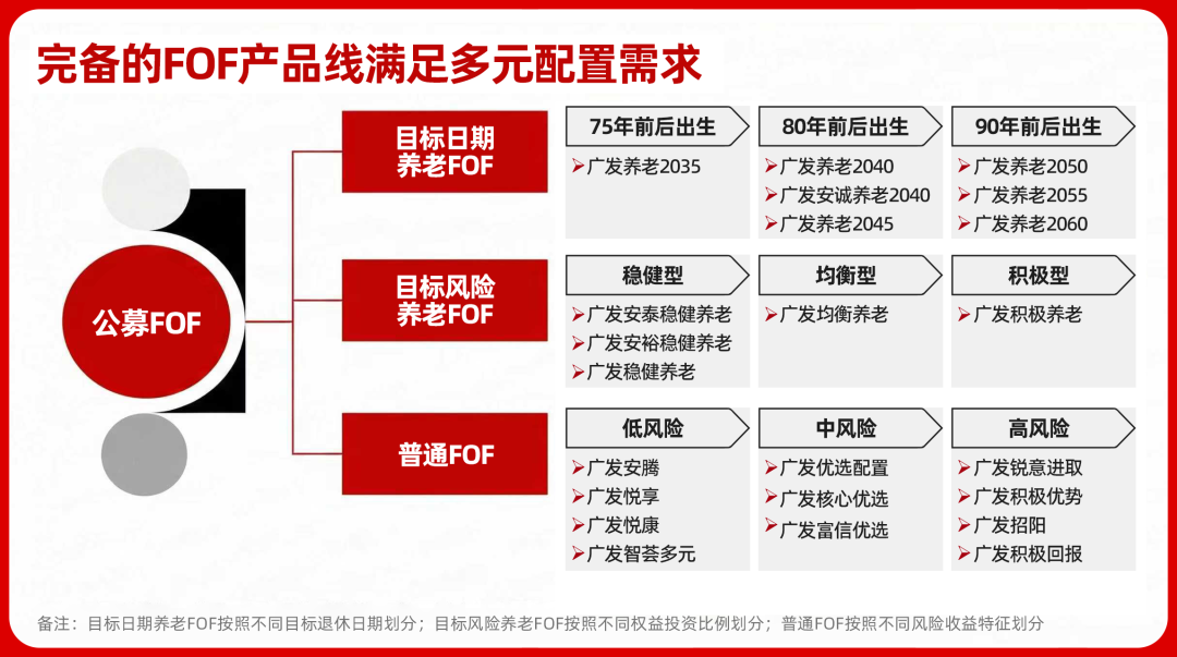 目前,廣發旗下共有23只FOF產品,涵蓋目標日期養老FOF、目標風險養老FOF和普通FOF,產品線品類齊全、策略豐富,可滿足多元配置需求。