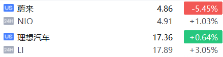 中概股理想汽車夜盤漲超3%,蔚來漲超1%。