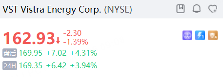 電力供應商Vistra夜盤漲近4%,宣佈收購Cogentrix,擴充行業領先的發電資產組合。