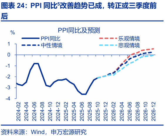 [5]中性情境下,2026年國際油價中樞或爲65美元/桶,銅價保持高位,國內鋼價低位震盪,國內煤價或有所上行;中下游方面,雖然民企佔比較高、反內卷政策推進速率或偏慢,但也有望更穩健的推動中下游價格逐步走出通縮;預計PPI同比在明年9月轉正。樂觀情境下,若國際油價中樞爲75美元/桶,國內反內捲進度推進較快,PPI同比轉正時點或在明年7月。悲觀情景下,國際油價中樞回落至55美元/桶,國內反內卷推進進度較慢,PPI同比轉正時點或在2027年初。