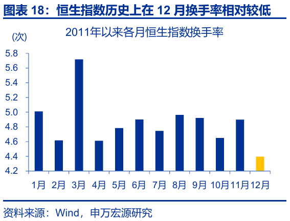 第二,港股市場或以獲利了結交易爲主,市場整體交投清淡限制了港股對利好因素的即時反饋。1)本輪匯率升值更多由外因驅動而非基本面改善,這弱化了外資的“配置效應”。2)歷史回溯來看,2011年以來恒生指數12月的平均換手率爲4.4次、爲全年各月份最低。3)11月13日以來,多家互聯網平臺企業等三季報業績不及預期,一定程度上強化了獲利了結交易的慣性。