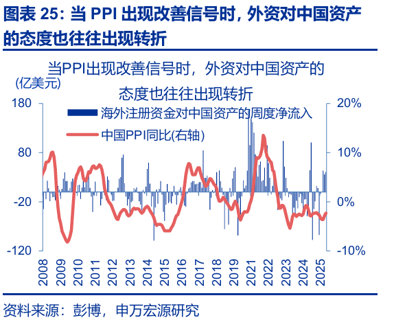 另一方面,人民幣匯率升值對港股的“配置效應”也有望恢復:PPI的回升有望繼續吸引外資流入,居民存款再配置效應對港股也有溢出效應。1)在“反內卷”政策加碼下,供給收縮的預期升溫提振大宗商品價格,另一方面產能利用率的拖累在產能出清的影響下在明年亦有望逐步緩解,中國PPI在明年有望維持當前的改善態勢。歷史回溯來看,當PPI出現改善信號時,外資對中國資產的態度也往往出現明顯轉折。2)本輪潛在牛市,居民存款再配置有很大空間;多數情況下,內地投資者往往在A股賺錢效應明顯擴散後,將戰場轉移至港股。