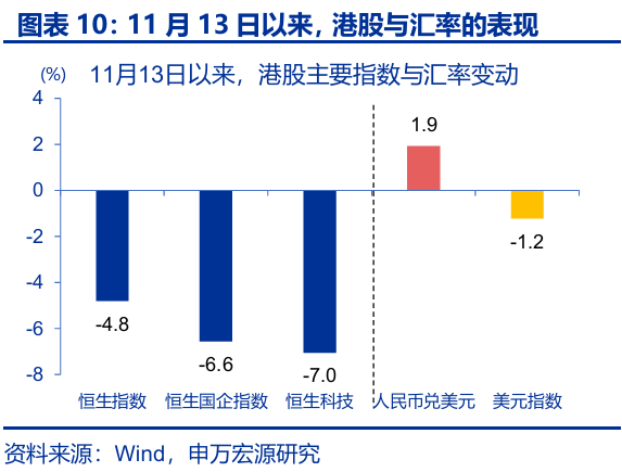 歷史回溯來看,人民幣與港股有着顯著的正相關關係;但近期人民幣快速升值,港股卻仍走弱。2016年以來,港股與美元兌人民幣的負相關係數高達-0.54;當人民幣月漲幅超過1.5%時,恒生指數當月有93.5%的概率上漲。然而,11月13日以來,人民幣快速升值1.9%,恒生指數卻下跌4.8%、與匯率顯著背離;這是2016年以來12次人民幣升值中第3次出現的股匯背離。