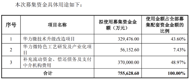公告顯示,華虹公司計劃通過發行股份方式,向華虹集團等4名交易對方購買其合計持有的上海華力微電子有限公司(以下簡稱華力微)97.4988%股權。同時,公司擬向不超過35名符合條件的特定對象發行股票募集配套資金,發行價格定爲43.34元/股,募集資金不超過75.56億元。