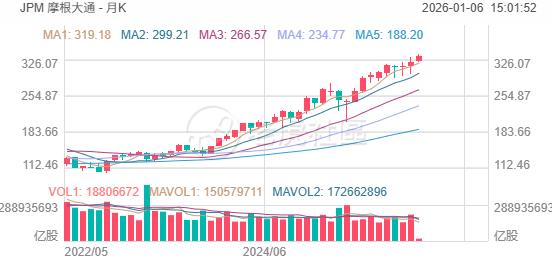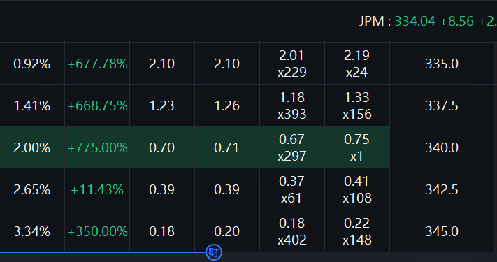 期權方面,我們注意到摩根大通的認購合約集體暴漲,其中一張1月9日到期的CALL,行權價340美元,價格漲幅達775%。其餘還有多張合約出現600%以上的漲幅。