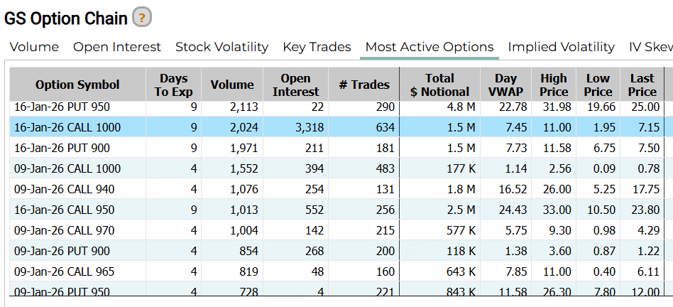 高盛方面,一張1月16日到期的CALL,成交量排在當日第二位,行權價達1000美元。