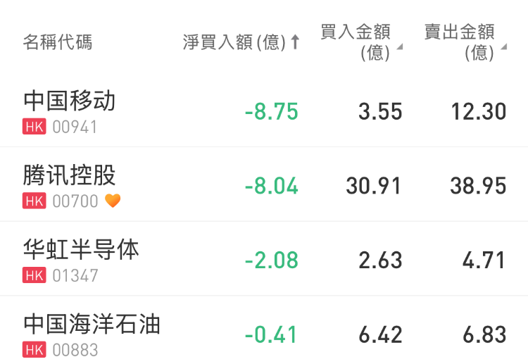 中國移動、騰訊控股、華虹半導體分別遭淨賣出8.75億港元、8.04億港元、2.08億港元。