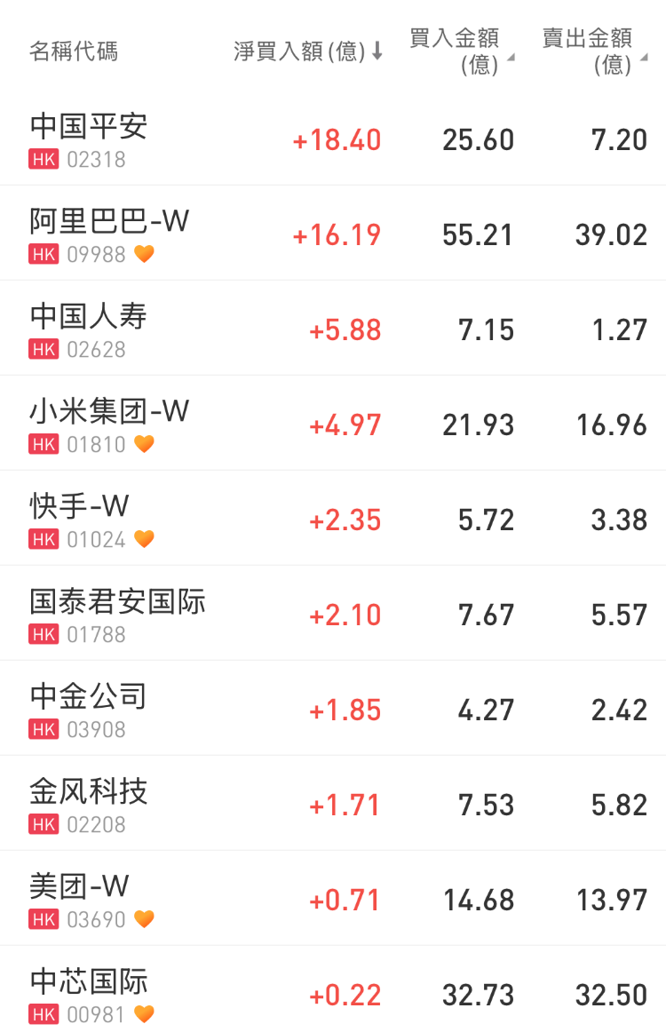 中國平安、阿里巴巴-W、中國人壽分別獲淨買入18.4億港元、16.19億港元、5.88億港元;
