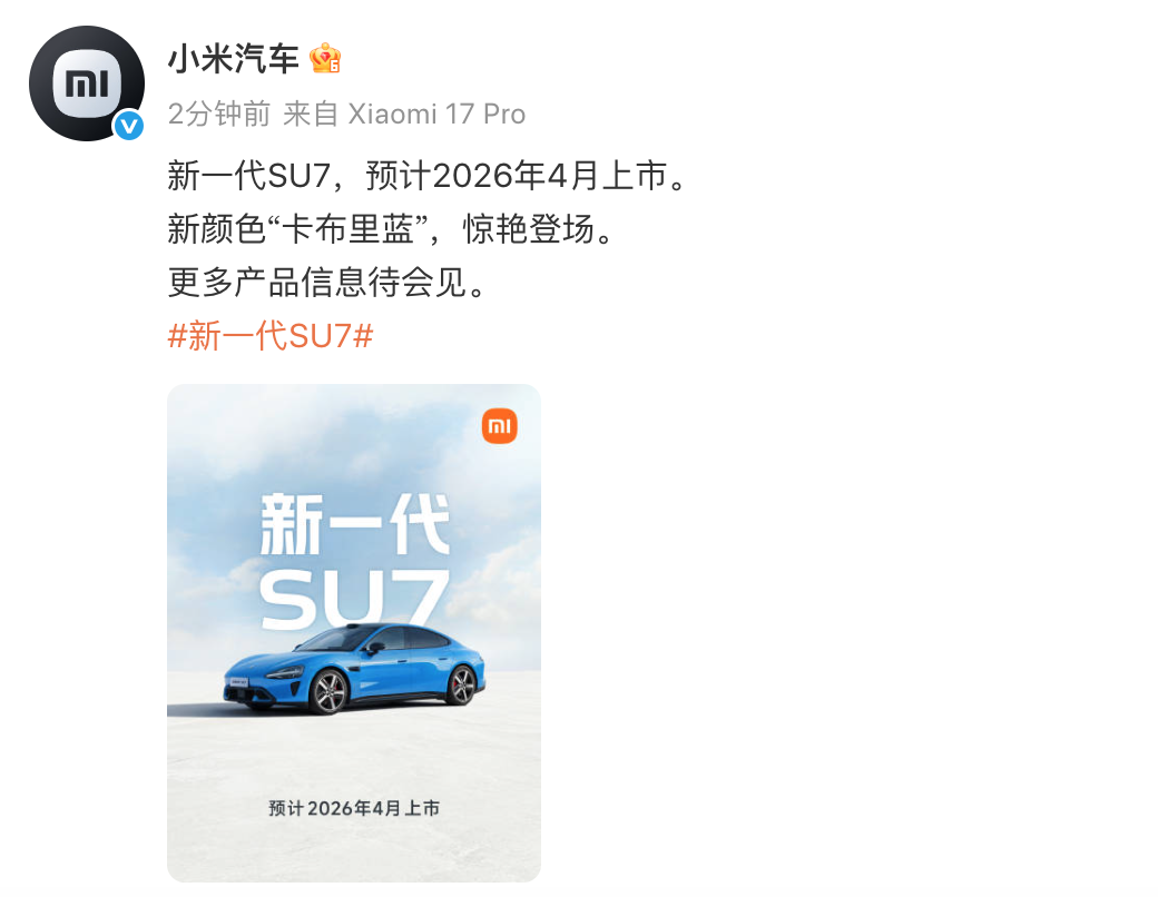 1月7日,小米汽車:新一代SU7預計2026年4月上市。