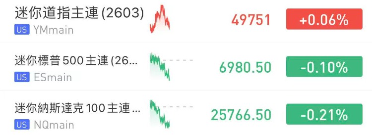 華盛資訊1月6日訊,盤前美股三大股指期貨漲跌不一,截至發稿,納指期貨 $NQmain 跌0.21%,標普500期貨 $ESmain 跌0.10%,道指期貨 $YMmain 微漲0.06%。
