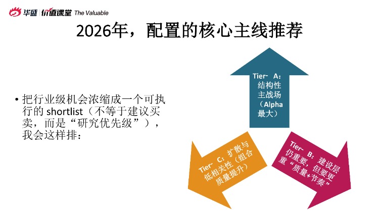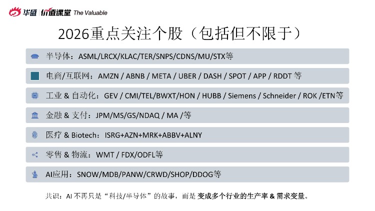 接下來,言財老師還給出了2026年美股配置的核心主線推薦。把行業級機會濃縮成一個可執行的shortlist(不等於建議買賣,而是“研究優先級”),