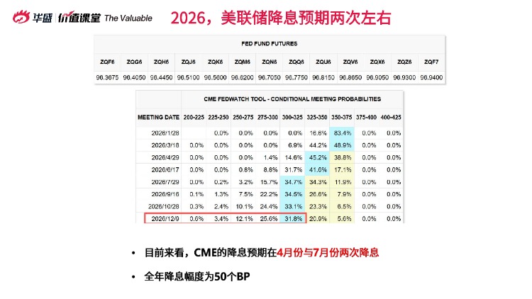言財老師表示,2026共識是降息兩次左右,再降到3%左右的“略偏緊中性”水平,但考慮到今年美聯儲主席鮑威爾即將卸任,新任主席人選仍存在較大不確定性,可能會影響市場預期。
