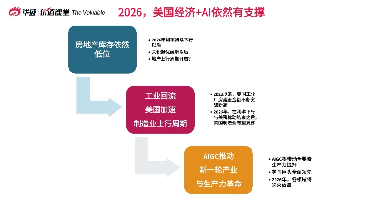 步入2026年,大多數投資者的擔憂點,可能在於美國經濟是否會陷入衰退。言財老師在直播中表示,美國經濟依然有支撐,有以下三點理由: