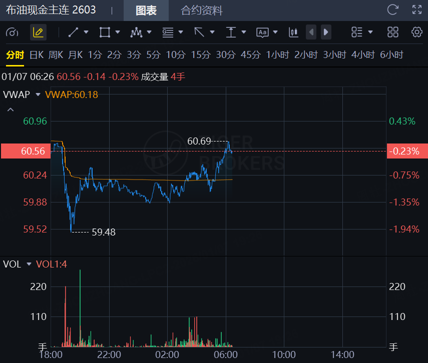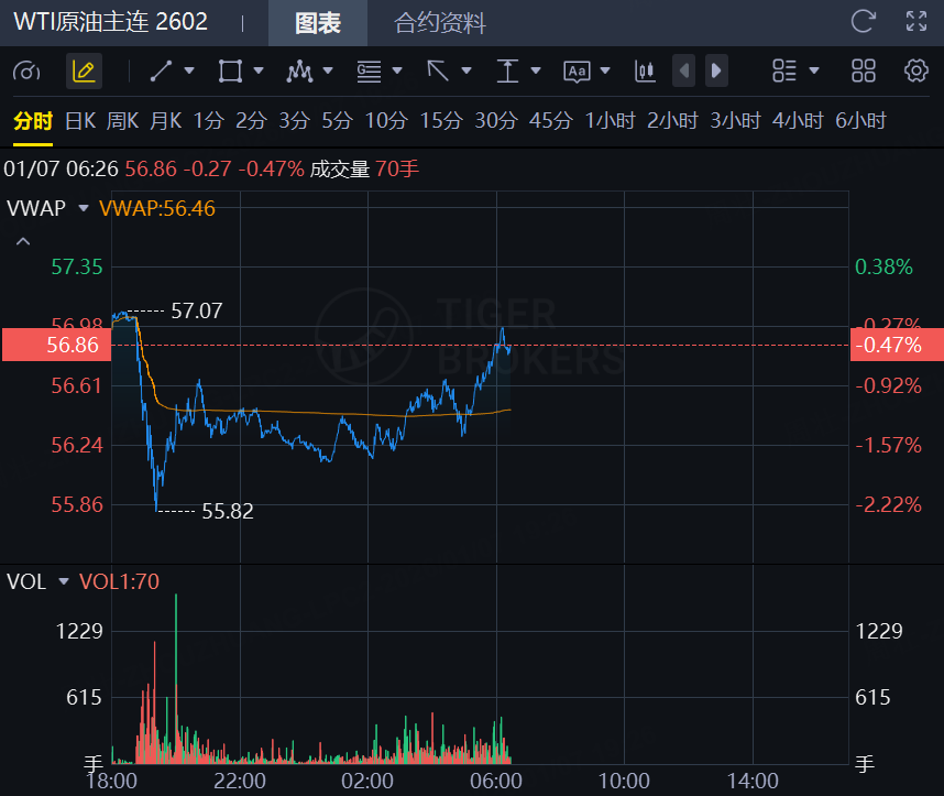 原油期貨日內走低,截止發稿,WTI原油跌0.47%,報56.86美元/桶;布倫特原油跌0.23%,報60.56美元/桶。