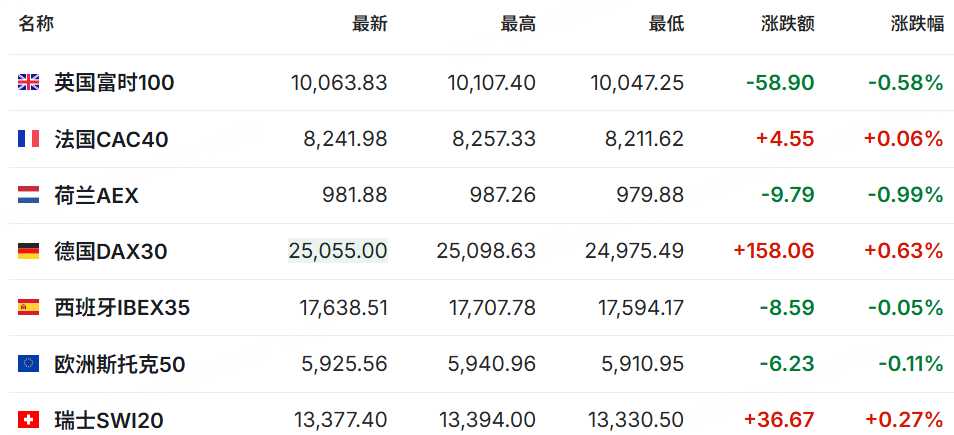 歐洲主要股指漲跌不一,截至發稿,英國富時100跌0.58%,法國CAC40漲0.06%,德國DAX30指數漲0.63%。