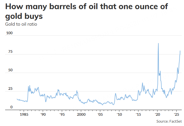 目前一盎司黃金幾乎可以買到 80 桶原油,這一比率在過去 35 年中僅在 2020 年疫情高峰時短暫出現過一次。