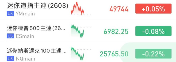 盤前美股三大股指期貨漲跌不一,截至發稿,納指期貨 $NQmain 跌0.22%,標普500期貨 $ESmain 跌0.08%,道指期貨 $YMmain 微漲0.05%。