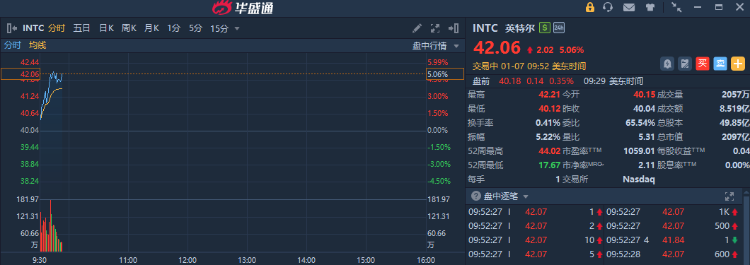 英特爾漲超5%,此前在CES展上推出下一代PC平臺處理器酷睿Ultra3。