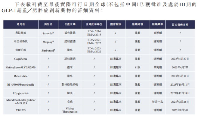 但這款核心產品尚未上市,就已面臨白熱化的市場競爭。全球範圍內已有三款GLP-1藥物獲批超重/肥胖症適應症,另有七款候選藥物處於三期臨牀階段;國內市場更是羣雄逐鹿,包括仁會的貝納魯肽、諾和諾德的司美格魯肽、禮來的替爾泊肽和信達的瑪仕度肽。此外,還有十餘種同類在研藥物處於三期臨牀試驗及生物製品許可申請階段。行業機構預測,到2029年國內可能有多達16種新的GLP-1類減重藥物上市,賽道競爭將進一步加劇。