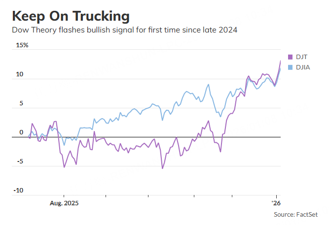 這是一年多以來,道氏理論首次在週二發出買入信號,當天道瓊斯工業平均指數(DJIA)和道瓊斯運輸平均指數(DJT)同時創下歷史收盤新高。