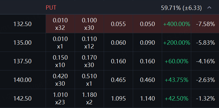 阿里的PUT成交價大漲,一張本週五到底的合約,行權價132.5港元,漲幅高達400%。