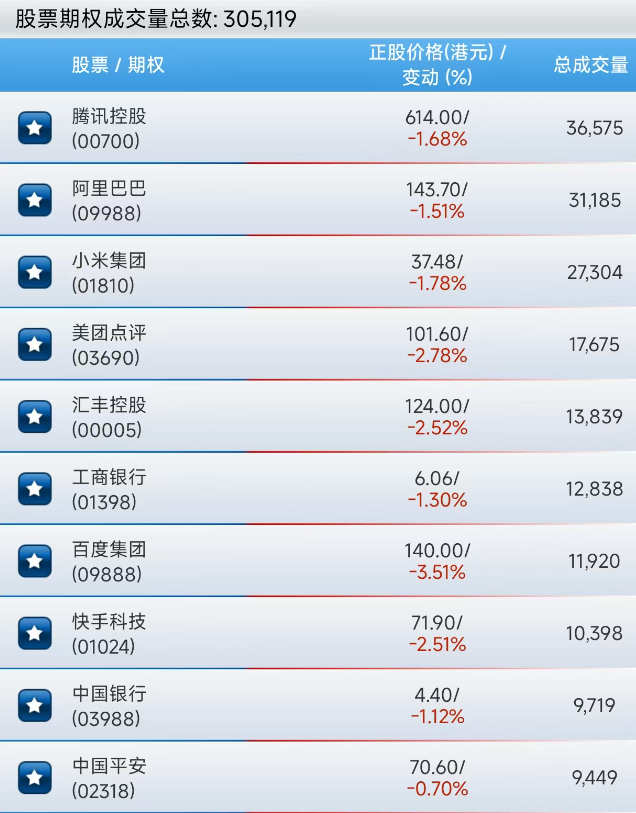 上午,港股股票期權成交305119張合約。騰訊成交居首,達36575張合約。阿里、小米、美團等緊隨其後。