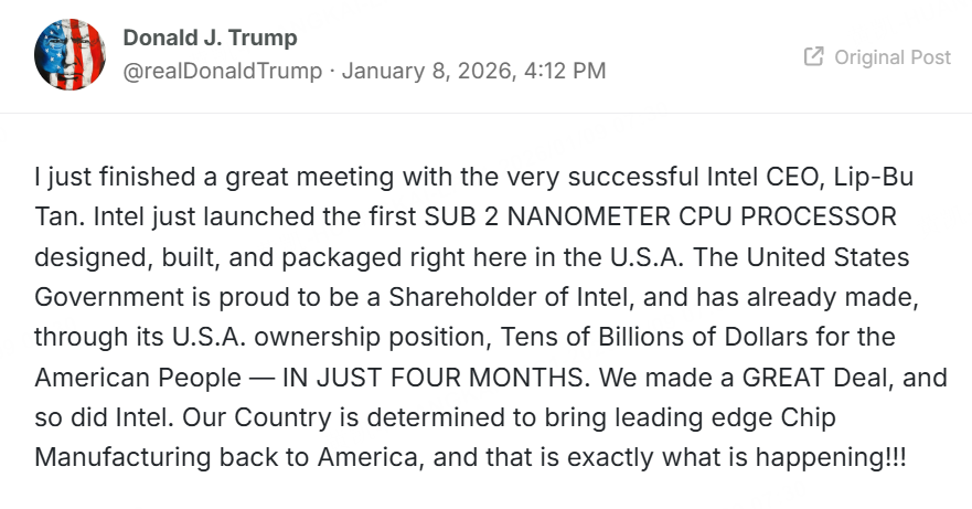 1月9日, 特朗普在公開平臺發文稱:“我剛剛與英特爾首席執行官陳立武結束了一場不錯的會談。