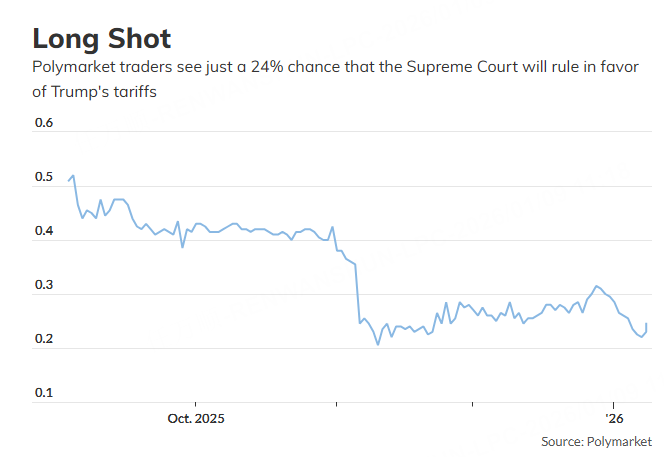 在加密貨幣驅動的預測市場 Polymarket 上,交易員僅給出 24% 的概率認爲最高法院會支持特朗普的關稅。由於去年底庭審中大法官提問的語氣,華爾街許多人已在爲不利於特朗普政府的裁決做準備。
