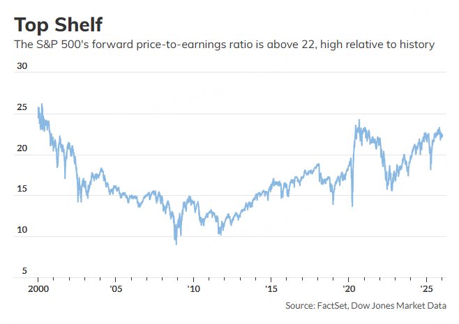 FactSet 數據顯示,截至週四,標普500指數市盈率超過22倍,顯示該指數相對於歷史水平估值偏高,幾乎與2022年1月初市場峯值時的估值相當,而當時正是長達九個月熊市的起點。