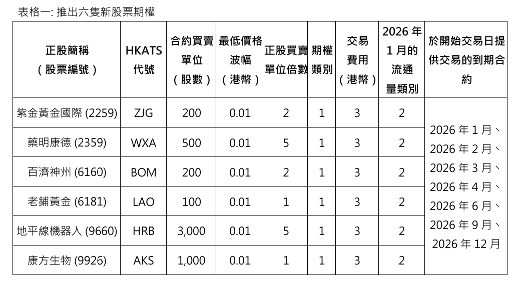 香港交易所宣佈將推出六隻新股票期權(僅限每月到期期權)並於2026年1月19日(星期一)開始買賣。交易於首星期(即2026年1月19日至2026年1月23日,包括首尾兩天),市場莊家的最大買賣盤差價責任要求將放寬爲原本責任要求的兩倍。