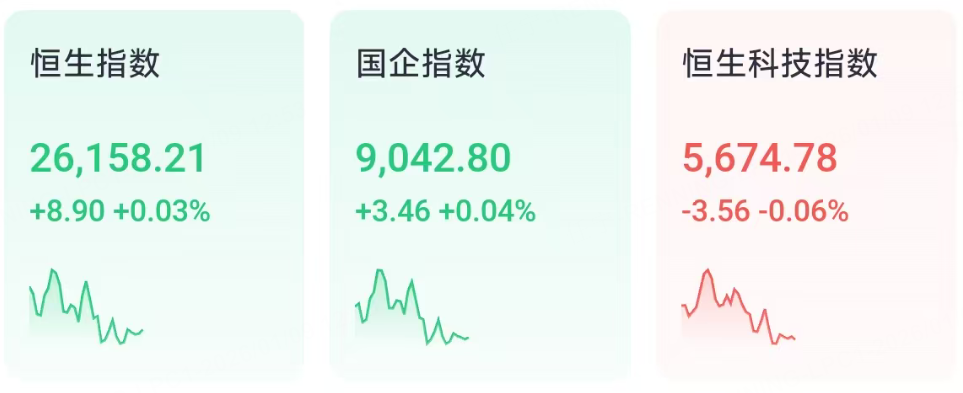 今日上午,港股上三大指數盤初衝高後持續走弱,臨近午盤集體曾集體轉跌。截至午間收盤,恒生指數漲0.03%,國企指數漲0.04%,恒生科技指數跌0.06%。