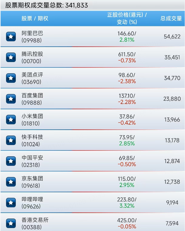 港股股票期權上午成交341833張合約。其中, 阿里巴巴-W 成交量排名居首,達54622張合約。騰訊、美團、百度、小米等緊隨其後。