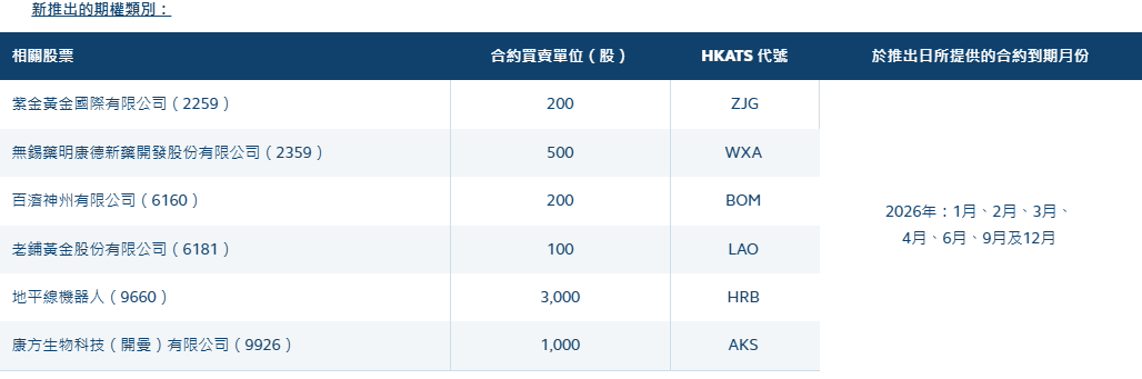 金吾財訊 | 香港交易所(00388)今天(星期五)宣佈,將於2026年1月19日(星期一)推出六隻新的股票期權類別,進一步拓展股票期權市場及爲投資者提供更豐富的選擇。香港交易所的衍生產品市場去年的日均成交量爲1,662,751張合約,按年升7%並創出紀錄新高。其中,股票期權(包括每月及每週到期合約)是交投最活躍的產品之一,去年的日均成交量亦創出879,831張合約的紀錄新高,按年增加22%。
