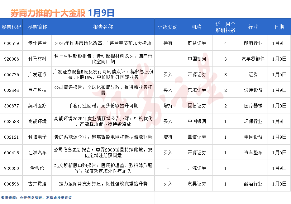 貴州茅臺最受券商關注,近一個月獲國信證券、東吳證券等4份券商研報關注,位居1月9日券商力推股榜首。