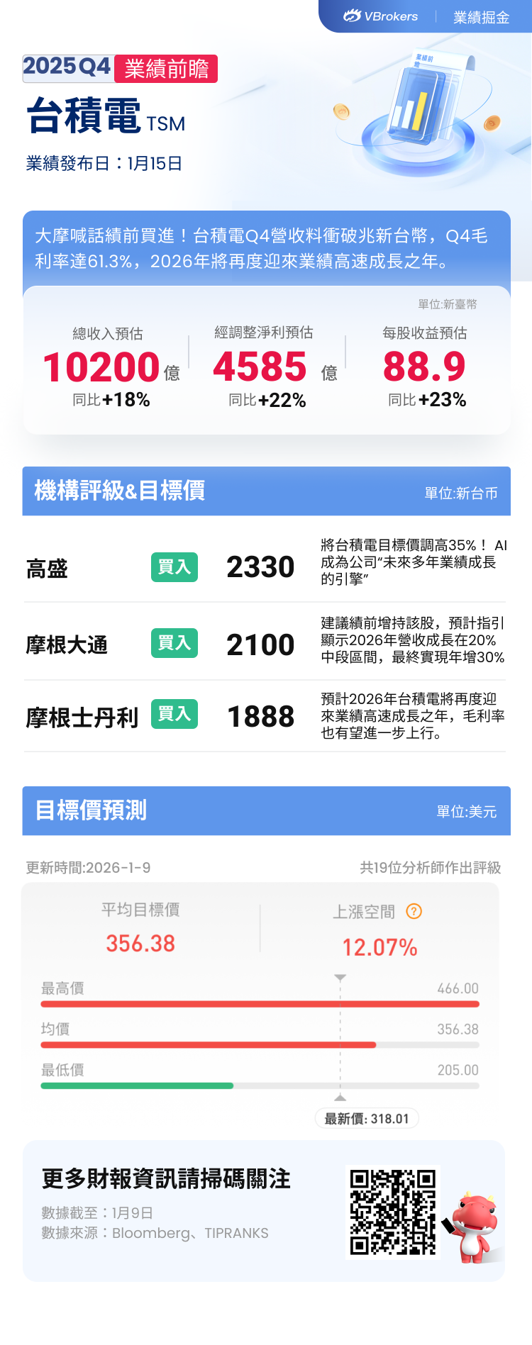 摩根士丹利認爲公司營收和利潤率具有增長潛力,並建議投資者在2026年初之前增持該股。預計臺積電將在指引中顯示2026年營收增長在20%中段區間,最終實現同比增長30%;並預計公司在2025年第四季度毛利率將突破60%,2026年全年保持在60%以上。