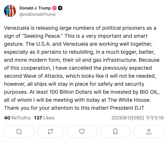 美國總統特朗普在社交媒體最新發文:“委內瑞拉正釋放大批政治犯,並將其視爲“尋求和平”的信號。這是一個非常重要且明智的姿態。美國和委內瑞拉正開展良好合作,特別是在以更大規模、更優質、更現代化的形式重建其油氣基礎設施方面。鑑於此類合作,我已取消此前預期的第二波攻擊,目前看來已無必要,但出於安全和保衛目的,所有艦船將維持原位。大型石油公司將投資至少1000億美元,我今天將在白宮與這些公司的全體代表會面。感謝你們對此事的關注!”