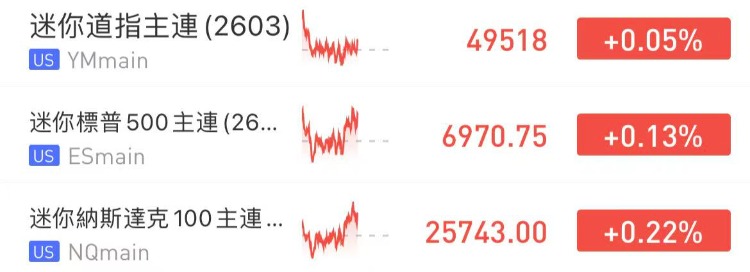 美股三大股指期貨盤前小幅上漲,截至發稿,納指期貨 $NQmain 漲0.22%,標普500期貨 $ESmain 漲0.13%,道指期貨 $YMmain 漲0.05%。