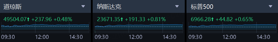 美東時間週五,美股三大指數集體收漲,截至收盤,道指漲237.96點,漲幅爲0.48%,報49504.07點;納指漲191.33點,漲幅爲0.81%,報23671.35點;標普500指數漲44.82點,漲幅爲0.65%,報6966.28點。美股三大指數本週均錄得漲幅,標普500指數本週上漲1.57%,而道指和納指分別上漲2.32%和1.88%。