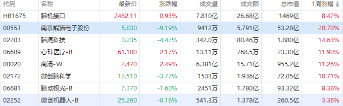 受此消息刺激,本週腦機接口概念大爆發,南京熊貓電子股份、腦洞科技、心瑋醫療-B等概念股均大漲。