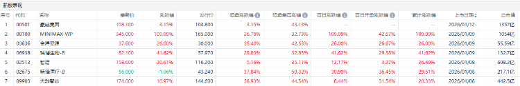 新股賺錢效應炸裂!本週6只港股新股上市集體收漲,其中AI大模型公司MINIMAX-WP暴漲109.09%,瑞博生物-B上市首日漲超41%,國產手術機器人龍頭精鋒醫療-B首日大漲超30%。