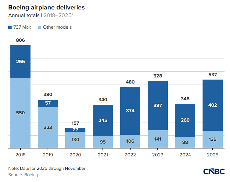波音有望報告自 2018 年以來年度飛機交付量最高的一年。