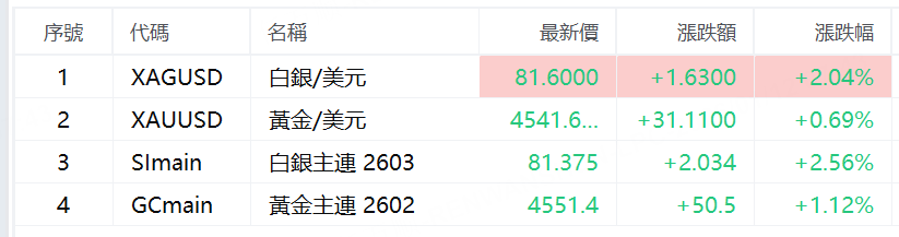 黃金主連 2602 向上突破4550美元/盎司,日內漲超1%; 白銀主連 2603 向上突破81美元/盎司,日內漲超2.5%。