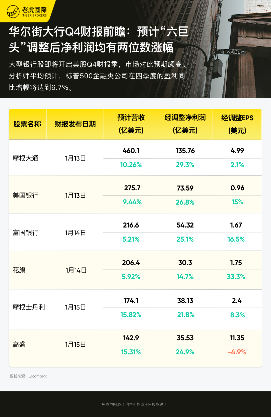 財報前瞻 | 華爾街巨頭領銜Q4財報季,預計調整後淨利潤均有雙位數增長
