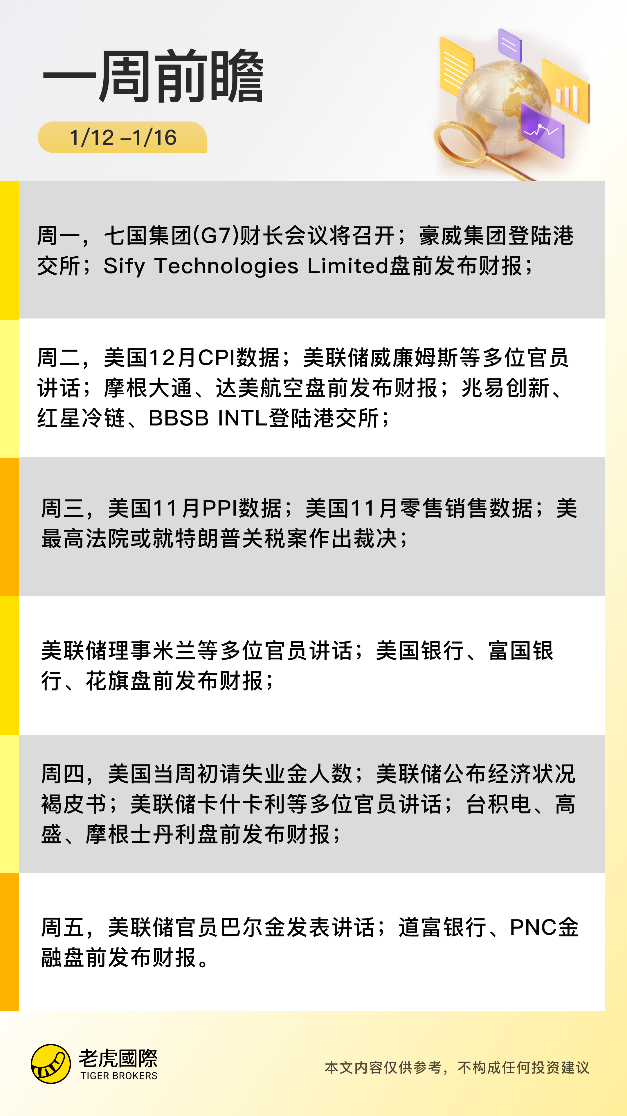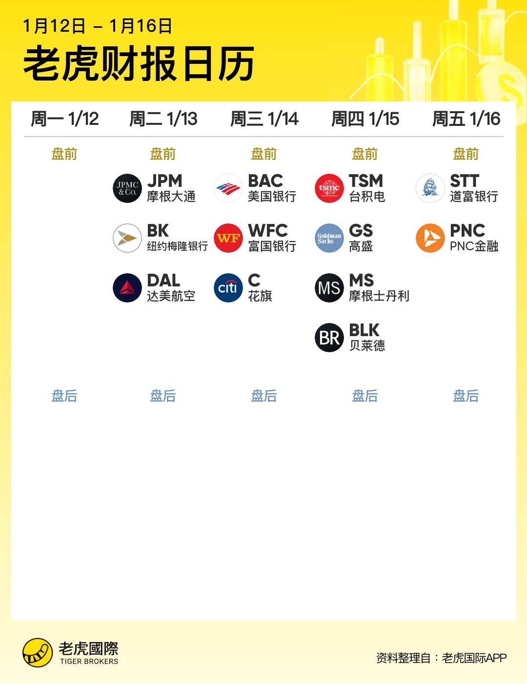 美股Q4財報季拉開序幕, 高盛、摩根大通、花旗、美國銀行、富國銀行、摩根士丹利等華爾街大行將率先放榜;此外,全球半導體代工龍頭臺積電將於1月15日發佈最新財報。