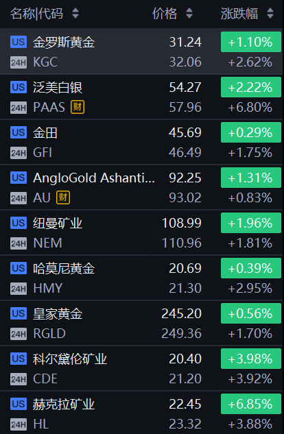 1月12日,美股夜盤時段,貴金屬板塊普漲,泛美白銀漲近7%,赫克拉礦業、科爾黛倫礦業漲超4%,金羅斯黃金漲近3%;金銀繼續狂飆刷新歷史新高;