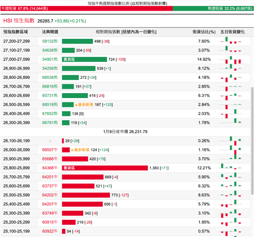 過去5日,恒指牛證合計約7045萬港元資金淨流入;恒指熊證則合計約2760萬港元資金淨流出。街貨分佈方面,恒指牛證街貨佔比約67.8%,分佈在收回價25800點至26200點之間,累計相當約1956張期指合約;恒指熊證街貨在收回價26300點至27100點之間,累計相當約2584張期指合約。
