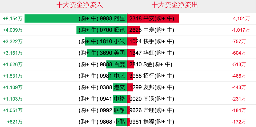 好倉(認購證及牛證)方面,過去5日,阿里相關好倉錄得約8154萬港元資金淨流入,爲最大資金流入標的,騰訊控股、小米集團及美團等相關好倉也分別約4009萬、3322萬以及3161萬港元資金淨流入部署;中國平安、中國人壽以及快手等相關好倉則分別約4101萬、1017萬及757萬港元資金淨流出套現。