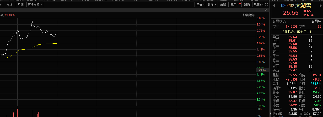 1月12日,太湖雪(920262)股價上漲,盤中漲幅一度接近4%。