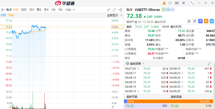 貴金屬概念股普漲,白銀ETF $SLV 盤前漲超5%,兩倍做多白銀ETF $AGQ 漲超11%,泛美白銀漲超7%,黃金ETF $GLD 盤前漲超2%。